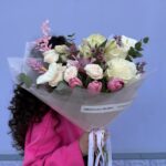 750 AED“Blush Harmony” is the embodiment of refined tenderness and elegance. White roses and calla lilies symbolize purity and sophistication, while pink tulips and spray roses add romance and warmth. The deep wine and lavender shades, combined with eucalyptus, give the bouquet a unique depth and expressiveness.