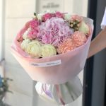 775 AEDA delicate round bouquet made of hydrangeas, roses, dianthus and hippericum, perfectly combines tenderness and elegance. This bouquet is made in pastel colors, which gives it a romantic and sophisticated look. It is ideal as a gift for special moments. Our flower shop BIRDS&FLOWERS has a huge selection of flowers and designer bouquets. We guarantee fresh flowers and careful treatment to each flower. Being self-importers of our flowers, we are the only flower shop in the country that receives flowers by air.